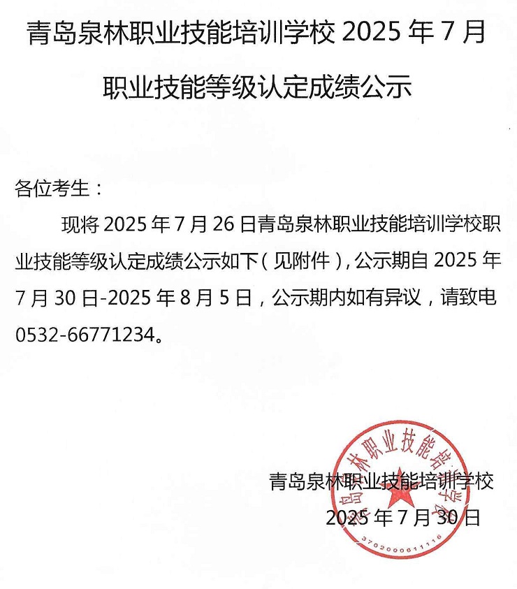 各位考生,现将 2025年7月26日青岛泉林职业技能培训学校职业技能等级认定成绩公示如下,公示期自2025年7月30日-2025年8月5日,公示期内如有异议,请致电0532-66771234。