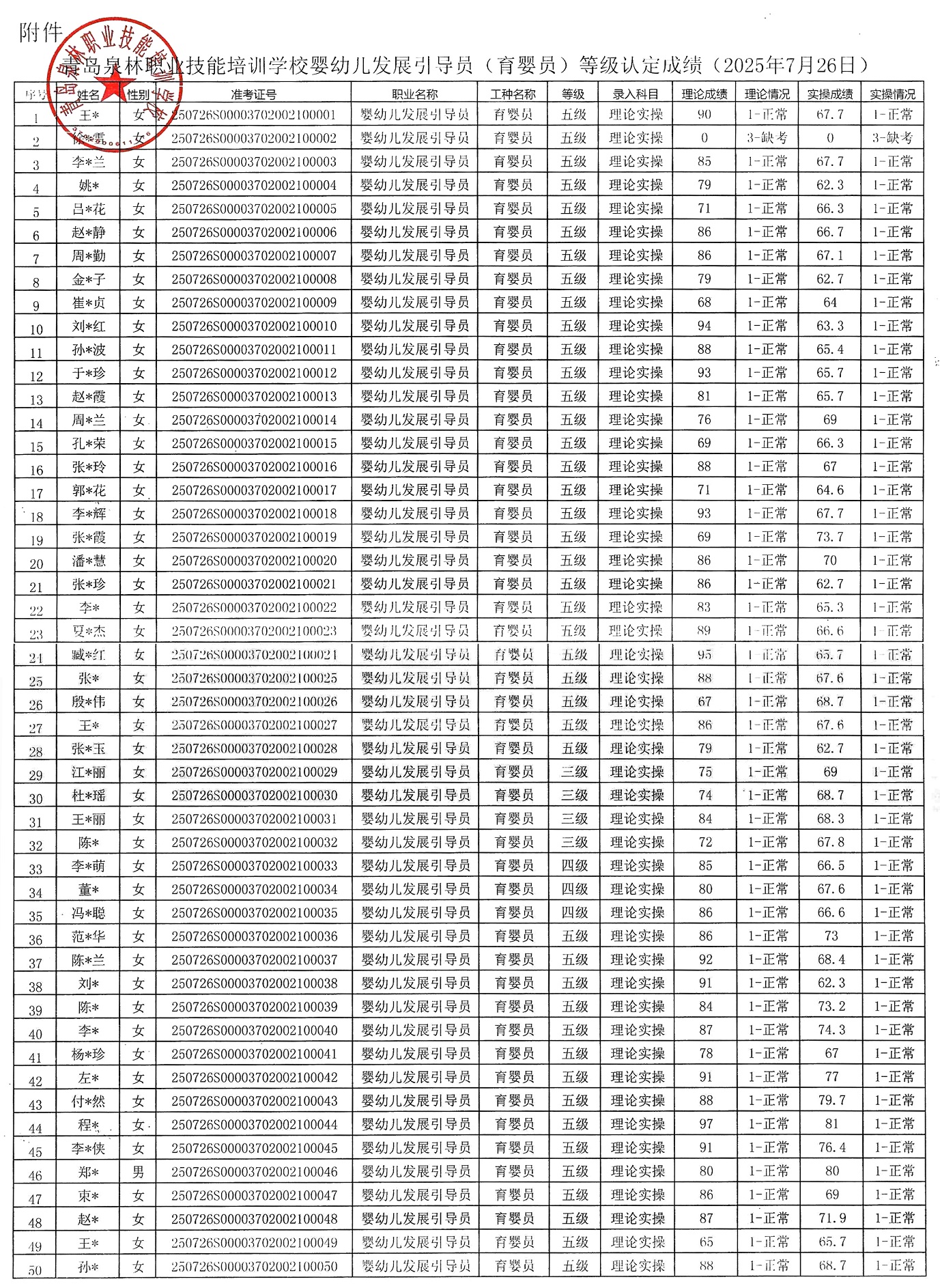 2025年7月婴幼儿发展引导员(育婴员)职业技能等级认定成绩公示