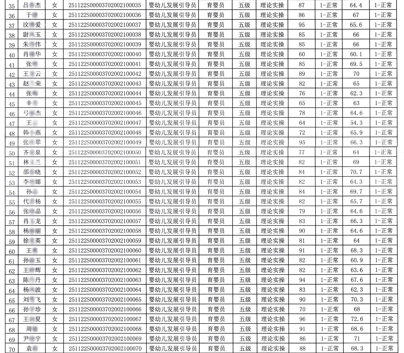 2025年11月婴幼儿发展引导员(育婴员)职业技能等级认定成绩公示